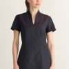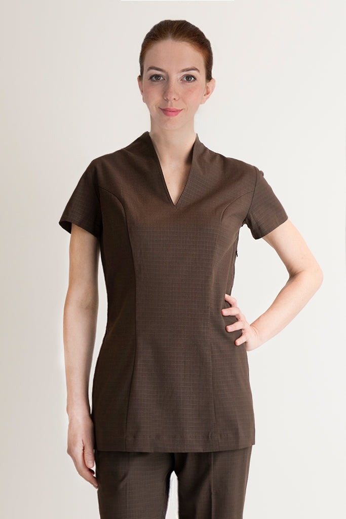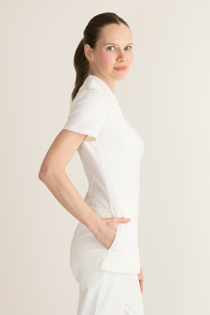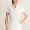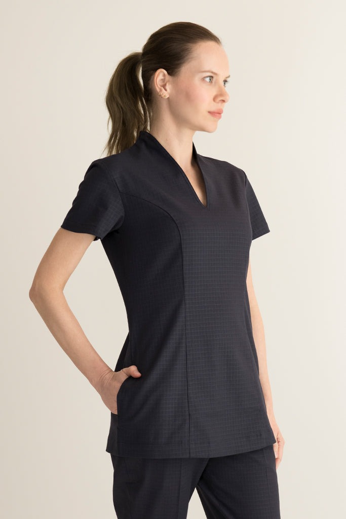 • Thiết kế chuyên nghiệp & Tinh tế:Thường là áo cổ chữ V, áo thun tay ngắn/lỡ, kết hợp với quần tây hoặc chân váy, tạo sự nữ tính, thanh lịch nhưng vẫn đảm bảo sự chuyên nghiệp, lịch sự.